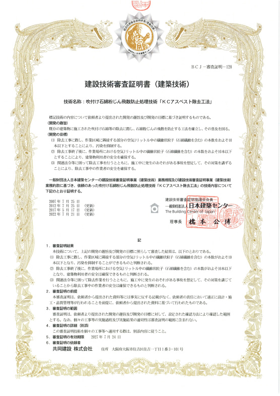 「KCアスベスト除去工法」として財団法人日本建築センターより、建築技術審査証明を取得。